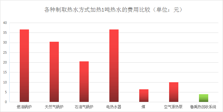 一般淋浴頭噴出洗浴熱水的溫度在40度左右,經(jīng)人體從頭到腳流到下水井的廢水溫度在35度左右,這些熱量被白白的浪費扔掉。而同樣的廢水經(jīng)過魯禹熱回收機組再排放時的溫度只有3-5度。35減去5度這就意味著有30度的熱能留在了機組里,在把14度左右的新鮮冷水引進機組里,14度加上30度等于44度,(注意!只是回收熱量不是回收水!)魯禹熱回收系統(tǒng)加熱1噸熱水的運營成本只需4度電,比電加熱節(jié)省75%以上電費,比燃煤、燃氣鍋爐節(jié)省50%以上運行成本。