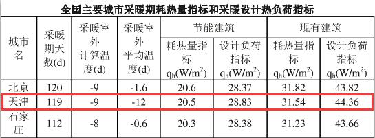 根據(jù)《全國主要城市采暖期耗熱量指標(biāo)和采暖設(shè)計熱負荷指標(biāo)》,天津地區(qū)節(jié)能建筑每平方米采暖季供暖所需熱量為28.83w/㎡*24h*119d/1000≈82.34kwh/㎡