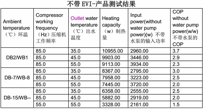 2)EVI對制熱能力的影響:在35度,45度這樣的低水溫下,制熱能力隨環溫度降低而衰減的趨勢是一樣的,但在55度水溫時,帶EVI后的制熱能力衰減明顯慢過不帶EVI產品的,EVI技術使得在55度水溫下制熱能力的衰減和35/45度下制熱能力的衰減類似;
