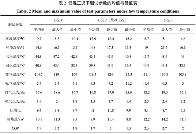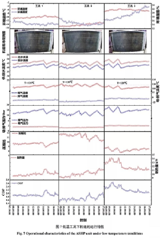 (3)最冷工況下,環(huán)境溫度均值-13.9℃,壓縮機平均排氣溫度為118.5℃,最高達到124℃,且機組有25%的時間其排氣溫度超過120℃,最高壓縮比達到11.7;運行期間機組頻繁發(fā)生“無霜除霜”的誤除霜事故以及頻繁停機的運行故障,機組的平均制熱量僅為9.9kW,COP為1.71,當溫度低至-15.2℃時,制熱量衰減幅度高達55%,COP僅為1.49。可見,低溫嚴重影響熱泵的正常運行。