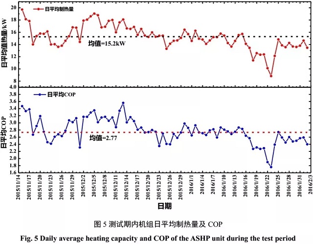 圖5為測試期內(nèi)機組的日平均制熱量和日平均COP具體情況。