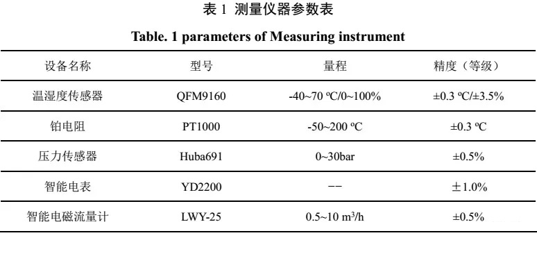 測試系統(tǒng)對空氣源熱泵的空氣側(cè)、制冷劑側(cè)與制取熱水側(cè)的運行參數(shù)以及能耗情況進行實時監(jiān)測。測試機組原理圖與實物圖如圖1中所示,在壓縮機吸/排氣管上分別設有溫度和壓力傳感器監(jiān)測壓縮機的吸/排氣溫度和壓力,在水側(cè)利用鉑電阻PT1000測量機組的進/出水溫度,利用電磁流量計測量水流量。其中主要的測量儀器參數(shù)如表1所示。