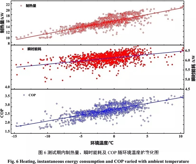 圖6為不同環(huán)境溫度下機組制熱量、瞬時能耗和COP的變化情況圖。