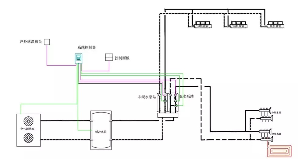 3、在設(shè)計兩聯(lián)供系統(tǒng)時,務(wù)必考慮在水力平衡的前提下,風(fēng)機盤管和地暖可以同時開啟。