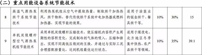 2018年11月5日,工業(yè)和信息化部發(fā)布《國(guó)家工業(yè)節(jié)能技術(shù)裝備推薦目錄(2018)》公告,其中“高溫氣源熱泵烘干系統(tǒng)節(jié)能技術(shù)、單機(jī)雙級(jí)螺桿型空氣源熱泵機(jī)組節(jié)能技術(shù)”兩項(xiàng)空氣源熱泵技術(shù)、案例成功入選《國(guó)家工業(yè)節(jié)能技術(shù)裝備推薦目錄(2018)》及《國(guó)家工業(yè)節(jié)能技術(shù)應(yīng)用指南與案例(2018)》。