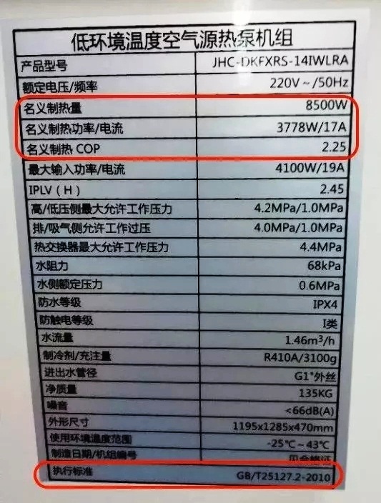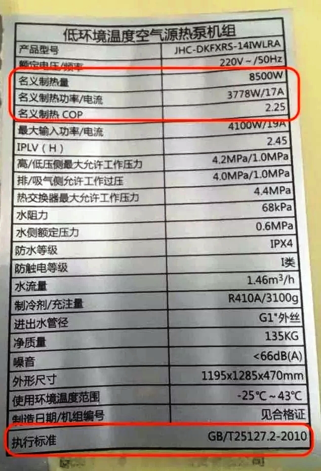 從其銘牌上我們可以看出,該機(jī)型執(zhí)行的標(biāo)準(zhǔn)是GB/T 18430.2。該標(biāo)準(zhǔn)適合于風(fēng)冷熱泵,其制熱名義工況是7℃。而根據(jù)北京農(nóng)委的要求,低溫空氣源熱泵的送檢要求為: