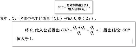 空氣作為可再生能源是取之不盡、用之不竭的天然資源。而熱泵技術是利用輸入少量的電能,從空氣中獲得高于輸入電能2倍~5倍的熱能來加熱被加熱對象,實現供熱的目的。空氣源熱泵工作中吸取空氣中的熱量是免費的,而輸出的熱能是以它為主的,根據熱泵制熱性能系數公式: