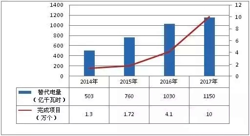 2016年,國網(wǎng)公司在居民采暖、生產(chǎn)制造、交通運輸、電力供應(yīng)與消費以及家庭電氣化五大領(lǐng)域累計推廣實施電能替代項目4.1萬個,替代電量達(dá)1030億千瓦時,首次突破1000億千瓦時大關(guān)。