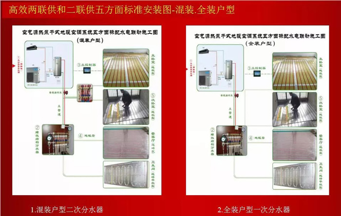 2、空氣源熱泵+(水箱+冷暖溫控中心+干式地暖高效末端)=高效二聯供