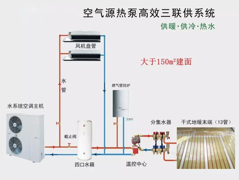 2)空氣源水系統+高效水地暖末端系統(臥室快裝電地暖)+壁掛爐,空調地暖熱水三聯供方案最優!