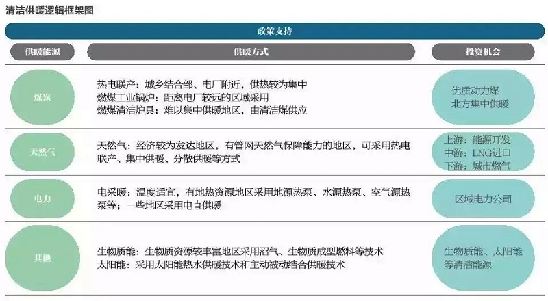 在操作層面,《規(guī)劃》已經(jīng)明確,參考城市和農(nóng)村供暖面積增速,按照整體供暖面積年均增速6%計算,預測到2021年,北方地區(qū)供暖面積約為276億立方米。按照清潔供暖面積不低于70%,具體目標是:清潔燃煤集中供暖、天然氣供暖、生物質(zhì)能清潔供暖、電供暖(含空氣源熱泵等熱泵類)、地熱供暖分別達到110億、40億、21億、15億、10億平方米。