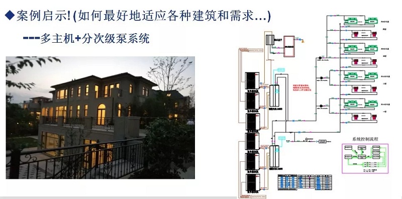 下圖是我們在杭州的一個大別墅案例,就采用了多主機+分次級泵系統,空氣源熱泵可以和末端直接通迅對接同時控制對應能力的壓縮機和次級泵的輸出,這里面運用了很多感應的技術,用戶對現在這個系統總體上還是非常滿意的,特別是我們解決了極低負荷下(如只有兩人在家開一個房間的制冷)時,水泵輸送功耗的問題,在大別墅里10%以下的低負荷運行占據90%以上的時間比,因此,低負荷下的能效比對用戶而言就非常關鍵!目前我們的技術平臺完全支持個性化的要求,這是我們智能熱泵能做到的。