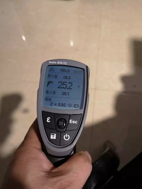 參訪期間,我們還分階段對別墅內每個房間、每個角落的溫度進行了現場實測,發現每個時段的溫度都會有所不同,房間和角落之間的溫差也都控制在1℃范圍以內,真正感受到二個房間溫差1℃的明顯不同感受。在室外零下2℃的時候,木地板房間的室溫23℃時,地板溫度的最大值為27.7℃,最小值為27.5℃,此刻的地磚地面的溫度又是25.2℃,地面溫而不熱,非常舒適的智能化的系統控制。